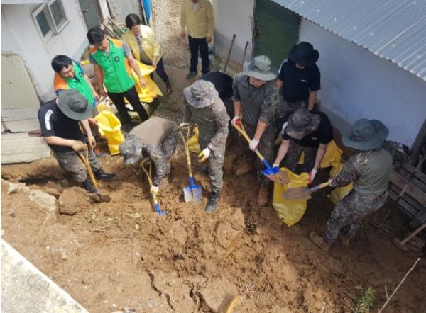 이어 집중호우로 피해를 입은 무장면 죽림마을의 한 독거노인의 피해주택을 찾아 유실된 경사지 복구를 위해 지역 민·관·군이 함께 힘을 보탰다.