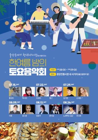 [중앙뉴스라인, 우제헌기자] 울산 중구가 오는 8월 말까지 매주 토요일 저녁 8시 중앙전통시장 내 울산큰애기 청년야시장에서 ‘한여름 밤의 토요음악회’를 개최한다.