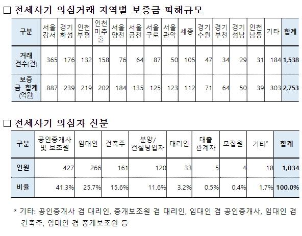 국토교통부는 전세사기 근절을 위한 범정부 특별단속 기간('22.7~'23.7)에 국토교통부가 보유한 정보를 조사ㆍ분석하여 검찰청과 경찰청에 공유하는 등 긴밀한 공조를 추진한 결과, 총 1,538건의 전세사기 의심거래 등에서 조직적 전세사기 정황을 포착했고, 이에 따라 해당 거래의 전세사기 의심 임대인과 관련자 1,034명에 대해 수사를 의뢰했다.