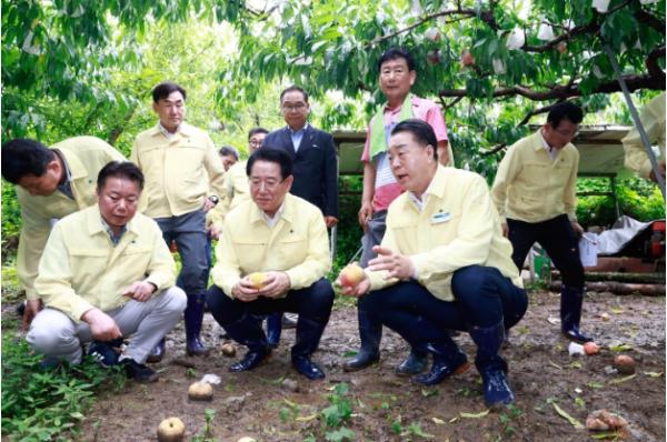 [중앙뉴스라인, 강영선기자] 화순군은 김영록 전라남도지사가 이날 오후 1시 30분경 화순읍 화림농원(대표 박장영)에 방문하여 집중호우에 따른 복숭아 낙과 피해 현황을 확인하고 피해 농가를 격려했다고 밝혔다.
