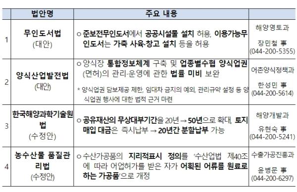 [중앙뉴스라인, 정향훈기자] 해양수산부는 ?무인도서의 보전 및 관리에 관한 법률 일부개정법률안?, ?양식산업발전법 일부개정법률안? 등 4개의 법률안이 7월 27일 국회 본회의를 통과했다고 밝혔다.