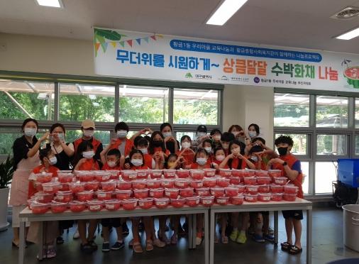 교육나눔 추진위원과 마을 청소년 20명은 황금종합사회복지관에서 장밋빛 자조 모임 회원들과 함께 수박화채 300개를 만들어 주변에 있는 기관과 가게 등 이웃에게 전달했다.