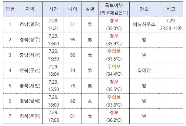 질병관리청에 따르면, 7월 29일 하루동안 온열질환 응급실 감시체계로 확인된 온열질환 사망자는 총 7명이다.
