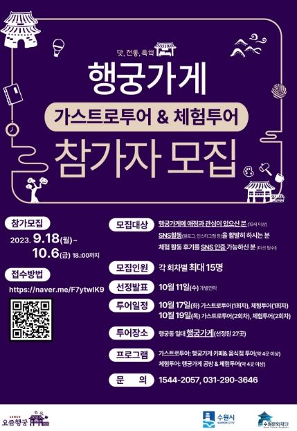 수원문화재단(대표이사 김현광)이 10월 6일까지 행궁동 ‘행궁가게 가스트로 투어 & 체험 투어’의 참가자를 모집한다.