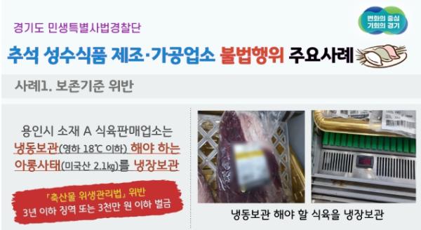 주요 위반 사례를 보면 용인시 소재 A 식육판매업체는 영하 18℃ 이하로 냉동 보관해야 하는 아롱사태(미국산 2.1kg)를 영하 0.8℃ 정도의 냉장고에 보관하다 적발됐다.