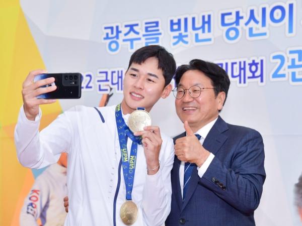 강기정 광주광역시장이 ‘항저우 아시안게임’ 한국 첫 2관왕 근대5종에서 개인?단체전 금메달을 획득한 전웅태 선수(28·광주광역시청)에게 축하 메시지를 전했다.