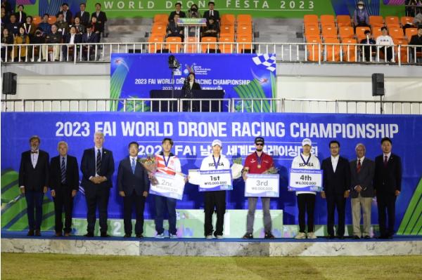 이밖에 드론레이싱대회의 챔피언을 뽑는 개인종합부문에서는 김민찬(한국) 선수가 제일 높은 성적을 거둬 2023 드론레이싱 챔피언에 등극, 1,500만원의 상금을 수여받았다.
