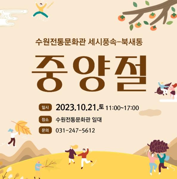 세시풍속-북새통 '중양절'은 사전 예약 없이 오전 10시 30분부터 현장 접수를 통해 참여 가능하다. 수원전통문화관 관계자는 “이번 중양절을 맞아 수원전통문화관에서 다양한 세시풍속 및 체험 프로그램 뿐만 아니라 공연도 함께 감상하며 선선하게 다가온 가을을 즐기셨으면 한다”라고 전했다.