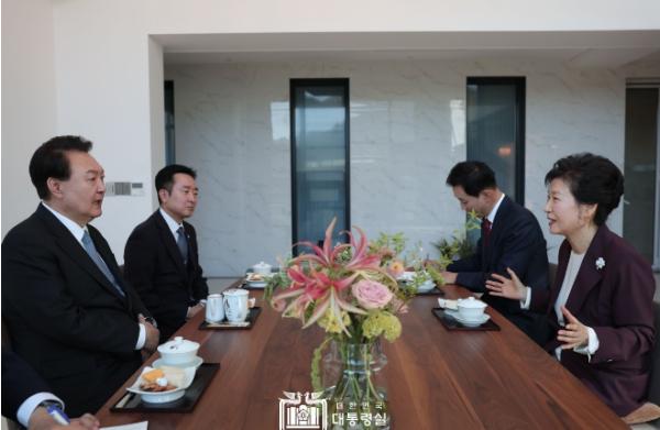 윤 대통령과 박 전 대통령은 거실에서 강승규 시민사회수석, 이도운 대변인, 유영하 변호사가 배석한 가운데 즐겁고 화기애애한 분위기에서 1시간 가량 환담했다. 박 前 대통령은 차와 과일을 냈는데, 윤 대통령이 차 중에서도 밀크티를 좋아한다는 걸 알고 홍차와 우유를 미리 준비했다. 홍차의 농도도 윤 대통령의 선호를 미리 파악해 맞췄다고 합니다. 과일은 윤 대통령이 좋아하는 감과 배를 정성스레 준비했다.