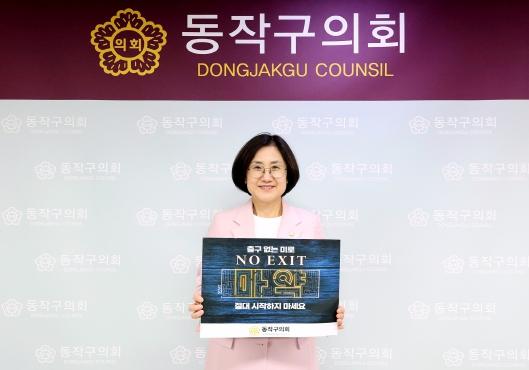 [중앙뉴스라인, 이승훈기자] 동작구의회 이미연 의장은 27일 마약 중독성의 심각성을 알리고 예방하기 위한 ‘NO EXIT’ 캠페인에 동참했다.