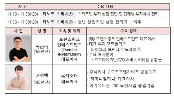 이번 행사는 창업기업-투자사 간 투자유치(IR 피칭)과 함께 1:1 면담 기회를 제공하는 사업연계(비즈매칭) 상담(컨설팅), 청년창업 발표회(세미나) 등으로 구성하여 청년 창업기업들의 투자유치와 상호 소통을 지원한다.