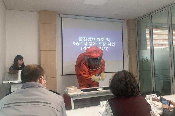 훈련은 ▲생물테러 대응 체계 및 초동 조치 교육▲개인보호구(Level A) 착·탈의 교육▲다중탐지키트 및 검체 포장·이송법 교육 등을 실시했다.
