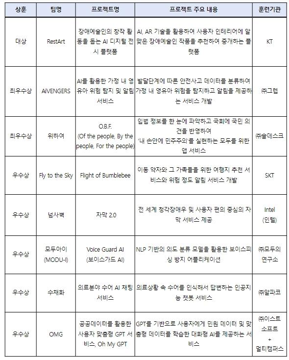 대상을 받은 리스타트(RestART)팀은 디지털 분야 선도기업인 케이티(KT)의 에이블 스쿨(AIVLE School) 출신으로, 인공지능 감성 추론모델을 이용한 장애 예술인 작품 중개 플랫폼을 개발했다.