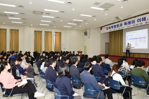이번 특강에는 5급 간부 공무원 포함 직원 200여명이 참석한 가운데, 전북연구원 장세길 책임연구위원이 강사로 나서 전북특별법의 비전 체계 및 특례 발굴 전략, 특례 제외 대상에 대해서 설명했다.