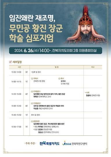 전북연구원 전북학연구센터는 오는 26일 오후 2시 전북특별자치도 의원총회의실에서 ‘임진왜란 재조명-무민공 황진장군 학술심포지엄’을 개최한다.