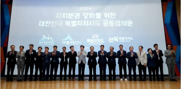 특히 이날 행사에서는 제주형 기초단체 출범을 위한 주민투표의 연내 실시와 관련 법률 제·개정안의 국회 통과를 위해 4개 특별자치시도가 공동결의문을 채택했다. 또한 특별자치시도의 자치분권 강화와 협력을 다짐하는 퍼포먼스를 진행해 주목을 받았다.