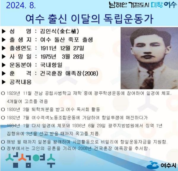[중앙뉴스라인, 이대수 기자] 여수시가 8월의 독립운동가로 여수 돌산 죽포 태생의 ‘김인식(金仁植) 선생’을 선정했다.