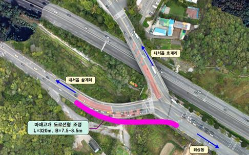 마재고개 삼거리는 좁은 회전반경으로 인한 사고위험이 많은 구간으로, 특히 내서읍에서 회성동 방향으로 도로 굴곡이 심해 선형개선 필요성이 꾸준히 제기되어 왔다.