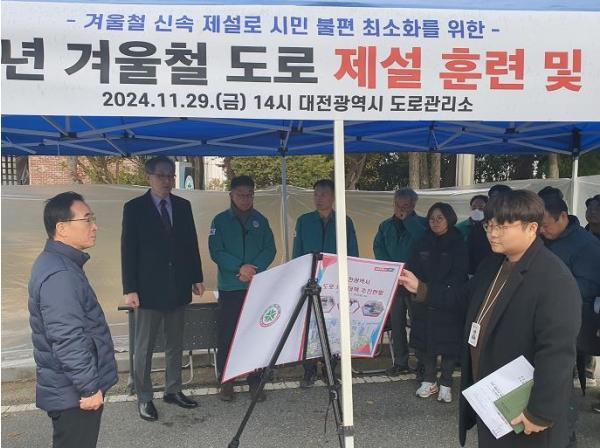 [중앙뉴스라인, 양병남기자] 대전시는 29일 건설관리본부 도로관리소(서구 복수동 소재)에서 시민안전실, 철도건설국, 건설관리본부, 5개 자치구 관계자 등이 참석한 가운데‘2024년 겨울철 도로 제설 훈련 및 점검 회의’을 개최했다.