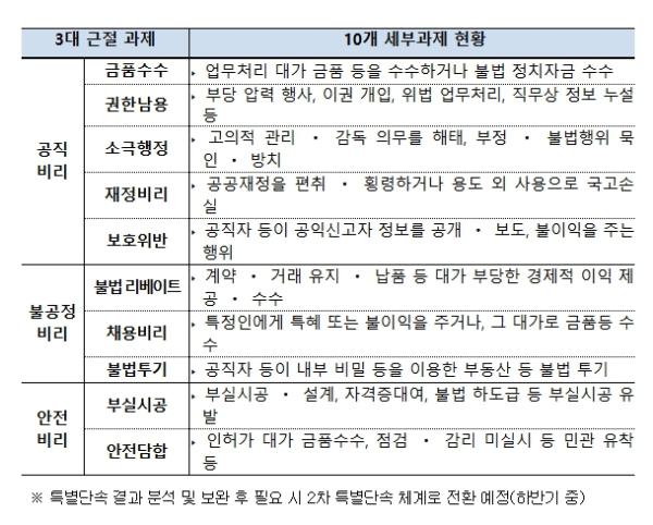 단속 과제는 ‘국민의 생명과 재산이 위협받지 않는 안전사회 건설(③안전비리)’과 ‘공정한 기회 ‧ 경쟁 보장(②불공정비리)’ 이라는 새 정부 정책 목표를 뒷받침하고, 정부 정책의 수용도를 높이고 이를 집행하는 공직사회에 대한 신뢰도를 회복하기 위해(①공직비리) 선정한 것으로, 새 정부 첫 부패단속 과제인 만큼, 더욱 엄정하고 성역 없는 단속이 전개될 예정이다.