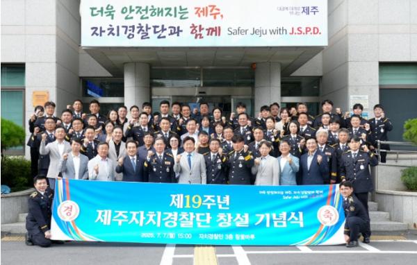 제주자치경찰단은 7일 오후 자치경찰단 3층 회의실에서 ‘과거를 돌아보고, 현재를 마주하며, 미래를 지향한다’는 주제로 창설 제19주년 기념행사를 개최했다.