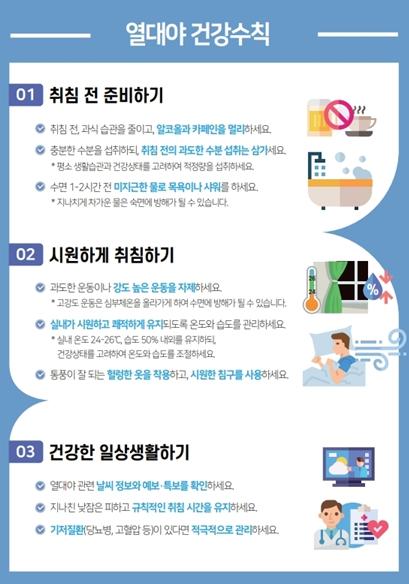 열대야로 인한 건강 피해는 기본적인 건강 수칙 준수만으로도 충분히 예방할 수 있으며 ▲ 열대야 관련 날씨 정보와 예보·특보 확인하기 ▲ 지나친 낮잠은 피하고 규칙적인 취침 시간 유지하기 ▲ 취침 전, 과식 습관을 줄이고, 알코올과 카페인 멀리하기 ▲ 충분한 수분을 섭취하되, 취침 전의 과도한 수분 섭취 삼가기 ▲ 실내가 시원하고 쾌적하게 유지되도록 온·습도 관리하기 ▲ 기저질환(당뇨병, 고혈압 등)이 있다면 적극적으로 관리하기 등의 실천이 중요하다.