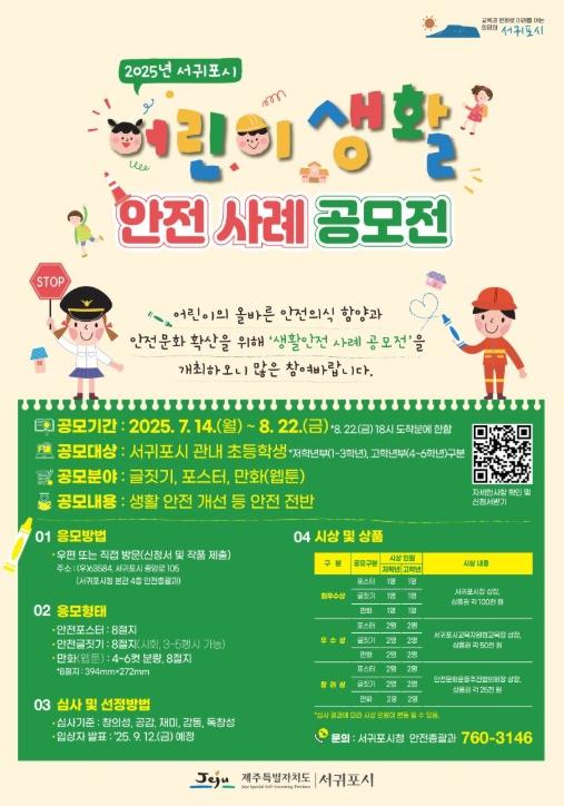 [중앙뉴스라인, 백흥순기자] 서귀포시는 관내 초등학생을 대상으로 '2025년 서귀포시 어린이 생활안전 사례 공모전'을 개최한다고 밝혔다.