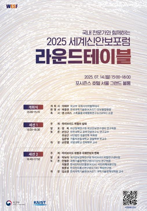 [중앙뉴스라인, 신기철기자] 외교부는 2025 「세계신안보포럼(World Emerging Security Forum, WESF, 9.8.(월) 개최 예정)」을 앞두고 정부와 국내 전문가 간 논의를 촉진·심화하기 위하여 7월 14일 한국과학기술원(KAIST)과 공동으로 라운드테이블을 개최했다.