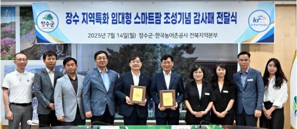 [중앙뉴스라인, 김용범기자] 장수군은 14일 군청 회의실에서 ‘장수군 지역특화 임대형 스마트팜’ 조성을 기념하며 한국농어촌공사 전북지역본부와 감사패를 상호 전달했다고 밝혔다.