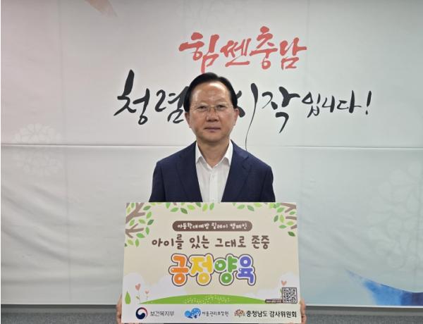 [중앙뉴스라인, 한장원기자] 충남도는 성우제 감사위원장이 아동의 권리를 보호하고, 학대 없는 사회를 만들기 위한 ‘아동학대 예방 릴레이 캠페인’에 동참했다고 17일 밝혔다.