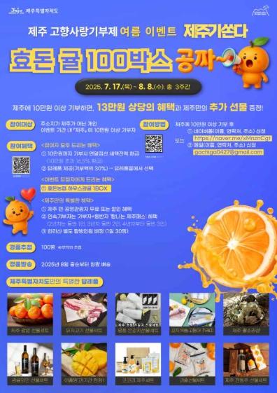 [중앙뉴스라인, 한하림기자] 제주특별자치도는 고향사랑기부제 활성화를 위해 ‘제주가 쏜다. 효돈 귤 100박스 공짜~’여름 이벤트를 실시한다고 밝혔다.