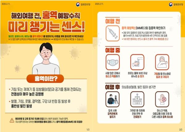 최근 세계보건기구(WHO) 자료에 따르면, 2024년 한 해 동안 전 세계 홍역 환자 수는 약 36만 명에 달하며, 유럽, 중동, 아프리카뿐 아니라 우리 국민이 많이 방문하는 동남아시아 지역에서도 홍역 유행이 지속되고 있어 해외여행 중 감염에 대한 주의가 필요한 상황이다.