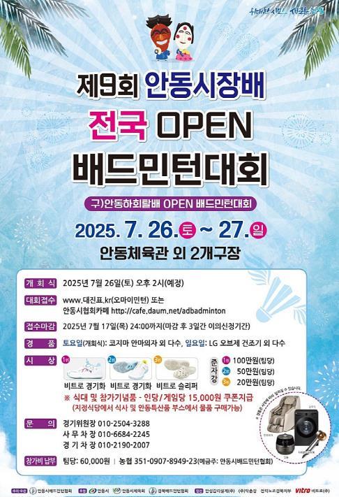 [중앙뉴스라인, 우제헌기자] ‘제9회 안동시장배 OPEN 배드민턴대회’가 오는 7월 26일부터 27일까지 이틀간 안동체육관과 안동다목적체육관에서 열린다.