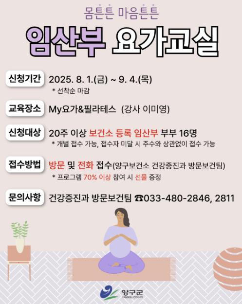 [중앙뉴스라인, 한소연기자] 양구군은 보건소에 등록된 임산부의 건강한 출산과 정서적 안정을 돕기 위해 오는 9월 5일부터 30일까지 ‘몸튼튼 마음튼튼 임산부 요가교실’을 운영한다고 밝혔다.