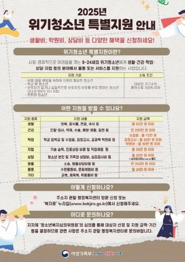 이번 사업은 '청소년복지지원법'에 따라 기존 복지제도로 보호받기 어려운 위기청소년을 지원하기 위해 추진하는 사업이다. 단순한 현금 지원을 넘어 생활·건강·학업·자립 등 분야별 맞춤형 서비스 제공에 중점을 두고 있다.
