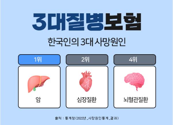 [중앙뉴스라인, 한성영기자] 흔히 3대질병이라 일컫는 암, 심혈관질환, 뇌혈관질환은 통계청 발표자료에 따르면 한국인의 주요 사망원인 중에서 3위 폐렴을 제외하고 1~4위를 차지하고 있으며, 이전부터 지금까지도 살면서 가장 먼저 대비해야 하는 치명적인 질병으로 강조되고 있다. 이러한 중대질병에 대비하기 위하여 상기 세가지 치명적인 질병을 집중보장하는 3대질병진단비보험을 많이 가입하고 있다. 3대진단비보험은 각각의 질병을 중점적으로 보장하면서도 가입자 특성에 맞는 특약을 추가함으로써 종합건강보험으로도 활용할 수가 있다.