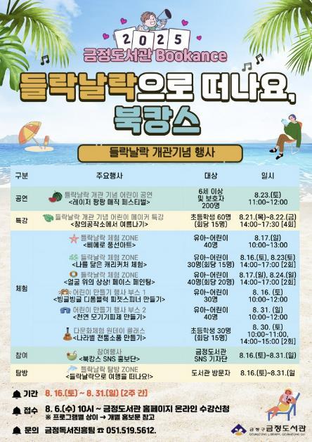 금정도서관 관계자는䄠월 방학과 휴가를 맞은 지역 주민들이 도서관에서 독서와 문화, 예술, 공연을 즐기면서 무더위를 이겨내고, 가족 단위 용자들이 도서관을 지역의 문화 쉼터로 인식하는 계기가 되길 바란다”라고 전했다.