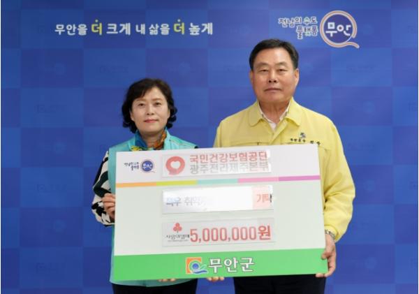 [중앙뉴스라인, 이상권기자] 전남 무안군은 지난 7일, 국민건강보험공단 광주전라제주지역본부(본부장 이영희)로부터 집중호우로 어려움을 겪고 있는 지역 내 주민을 위한 성금 500만원을 기탁받았다.