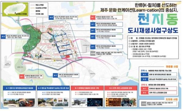 주요 사업내용은 ▲한류 및 제주문화 교류공간 조성, ▲K-푸드체험 거리 조성, ▲천지동 옛길 문화 정체성 확립, ▲천지 런케이션 센터 조성, ▲운영관리조직 육성 등의 도시재생사업을 추진하는 내용을 담고 있다.