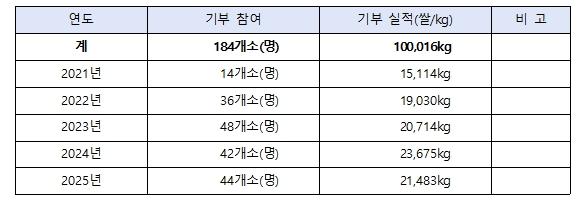 2021년 시작된 이 캠페인은 올해로 5년째를 맞았다. 누적 참여처 184개소(명), 총 기부량은 100톤(100,016kg)을 넘어섰다.