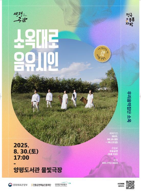 [중앙뉴스라인, 우제헌기자] 양평문화재단은 오는 8월 30일 오후 5시, 양평도서관 물빛극장에서 2025 시즌레퍼토리‘양평공감’의 여섯 번째 무대로, 우리음악집단 소옥 '소옥대로_음유시인' 을 선보인다.