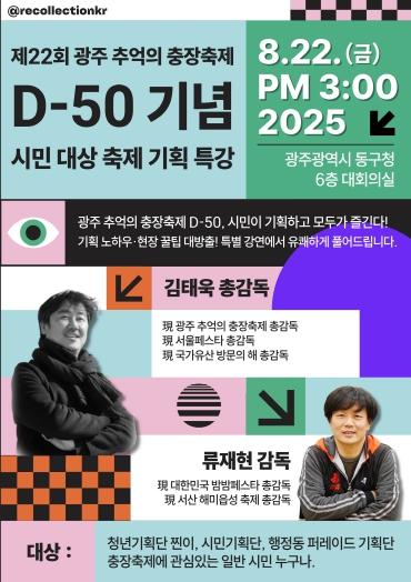 강연에는 김태욱 충장축제 총감독과 류재현 대한민국 밤밤페스타 감독이 강사로 나서 축제 기획의 전문적인 노하우와 현장 경험을 시민들과 나눌 예정이다. 김태욱 총감독은 여러 축제에서 총감독을 역임하며 쌓은 풍부한 축제 기획 경험을 바탕으로 시민 참여형 축제의 핵심 요소들을 전하고, 류재현 감독은 지역 고유의 문화적 정체성을 축제로 구현하는 방법론과 주민 주도의 지속가능한 축제 운영 모델에 대해 들려준다.