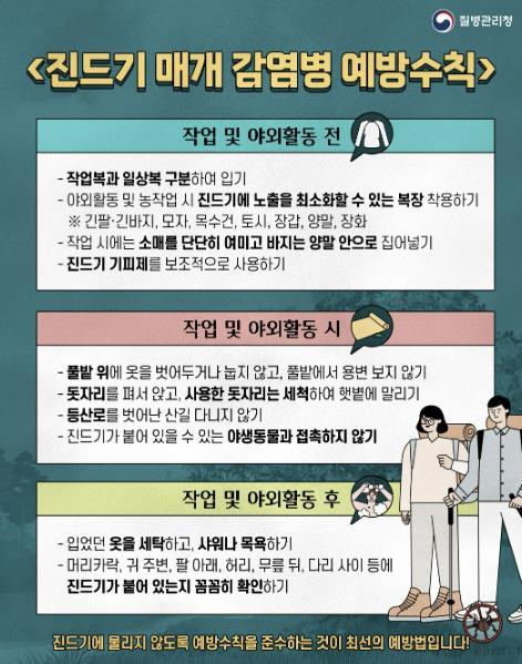 군은 진드기 매개 감염병 예방을 위해 야외활동 전·중·후 단계별로 예방수칙을 생활화할 것을 강조했다. 야외활동 전에는 작업복과 일상복을 구분해 착용하고, 진드기에 노출되지 않도록 긴 옷과 보호장비를 착용해야 한다. 특히 소매는 단단히 여미고 바지는 양말 안으로 넣는 것이 좋으며, 진드기 기피제를 보조적으로 사용하는 것도 권장된다.