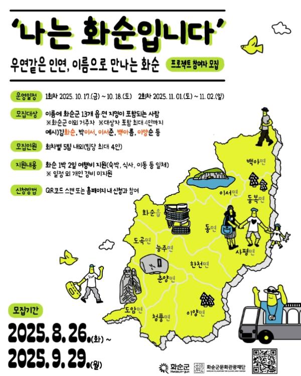 이번 프로젝트는 화순군 관외에 거주하며 화순읍, 능주면, 동복면, 도곡면, 동면, 이서면, 한천면, 백아면, 춘양면, 도암면, 청풍면, 사평면, 이양면 등 이름 속에 화순군 13개 읍·면 지명이 포함되는 사람(예: 이화순, 김이서, 이서준, 백아름, 이양순 등)을 대상으로 하여, 2025년 8월 26일부터 9월 29일까지 참여자를 모집한다.