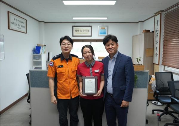 [중앙뉴스라인, 양병남기자] 경산소방서는 소화기를 사용해 화재를 진압하여 대형화재 피해를 막은 와촌 휴게소 근로자 양주은 사원에게 지난 3일 감사패를 전달했다고 밝혔다.