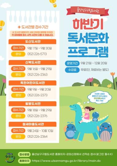 하반기 프로그램의 신청 기간은 9월 9일부터 10월 10일까지 각 도서관별로 다르게 진행하며 남구 구립도서관 누리집에서 선착순으로 접수받는다.