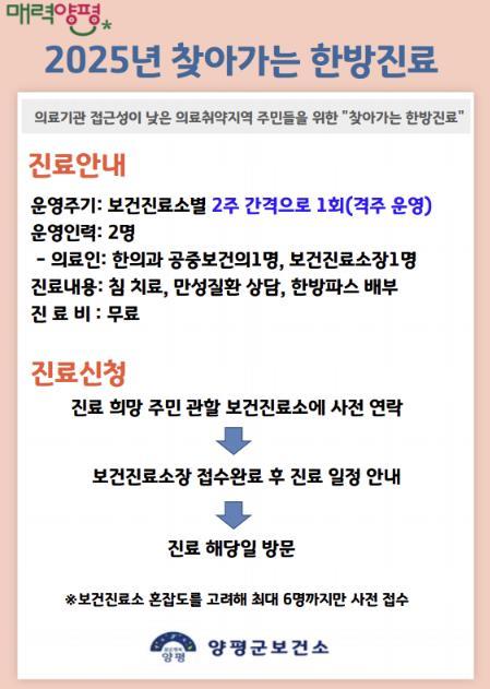 ‘찾아가는 보건진료소 한방진료’는 관할 지역 보건진료소를 통한 사전 예약제로 운영되며, 양평군민 누구나 이용이 가능하다. 운영 일정 및 신청 관련 자세한 사항은 양평군보건소 보건정책과로 문의하면 된다.