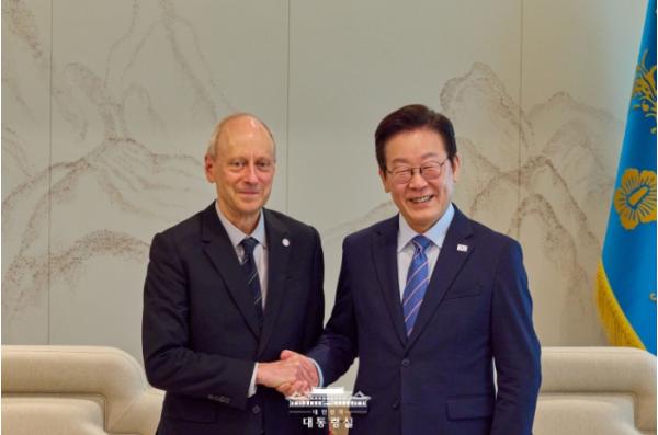 [중앙뉴스라인, 우제헌기자] 이재명 대통령은 오늘 오후 집무실에서 '정의란 무엇인가'의 저자인 마이클 샌델 미국 하버드대 교수를 접견했다.