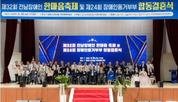 [중앙뉴스라인, 한장원기자] 영광군은 지난 30일 영광스포티움 국민체육센터에서 22개 시·군 장애인단체 등 1,500여 명이 참석한 가운데‘제32회 전남장애인한마음대축제 및 제24회 장애인동거부부 합동결혼식’을 성황리에 개최했다고 밝혔다.