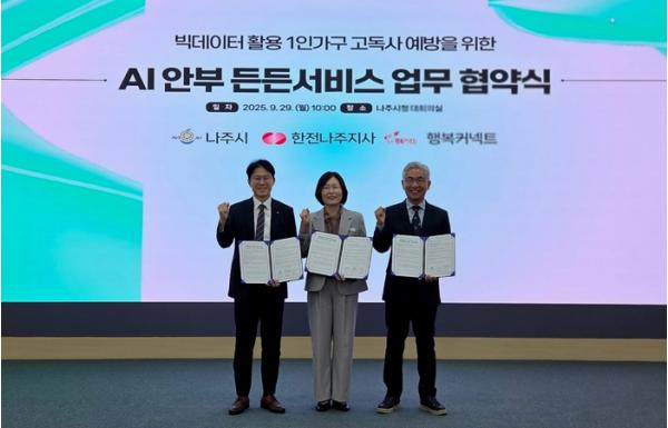 나주시(시장 윤병태)는 최근 한국전력공사 나주지사, SK재단법인 행복커넥트와 함께 1인 가구 사회안전망 강화를 위한 ‘AI안부 든든서비스’ 3자 업무협약을 체결하며 민관공이 함께하는 통합형 사회안전망 구축에 나섰다고 11일 밝혔다.